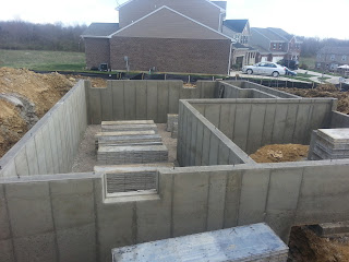 Yesterday, we climbed down into the basement and layed out the finished basement. The builder measured out where the stairs, the bathroom, etc would be so we could get a visual of sorts. After we layed out my initial plan, I decided that I did not like it and we completely redesigned everything on the spot. We found a much better layout in the basement that will allow it to be more open instead of chopped up. We are glad we climbed down and marked everything out with him instead of just going off of paper because it helped a ton. He had the walls water sealed today and the plumbing in the basement will go in tomorrow. Then, when we can get a string of dry days (and once we get the next money draw squared away), he can pour the basement and garage floors and start framing. He said he expects to start framing in 1.5-2 weeks.